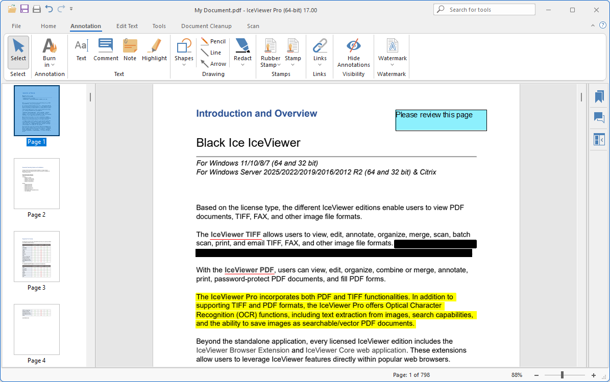 The IceViewer Pro allows users to view, print, OCR, annotate, search (and redact highlighted search matches) documents, scan, batch scan, email, and edit TIFF images, Faxes, medical Faxes through the standalone user interface. The IceViewer Pro can display Microsoft Office Document Imaging (MODI) annotations, OCR data, and WANG annotations.