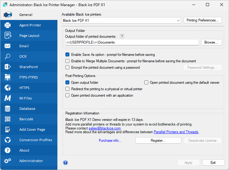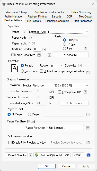 The Black Ice PDF X1 Printer Driver can print to Standard PDF, Compact PDF, PDF Image, PDF/A file formats, and supports PDF Linearization (Fast Web Viewing).