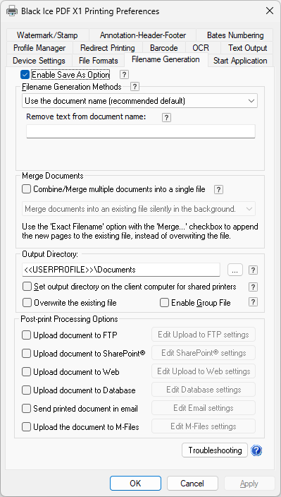 In addition, the PDF X1 Printer Driver allows users to send documents via Email, Upload documents to SharePoint, FTP/SFTP/FTPS, HTTP/HTTPS sites, M-Files, or a Database, and also create several configurable Barcode types on printed documents.
