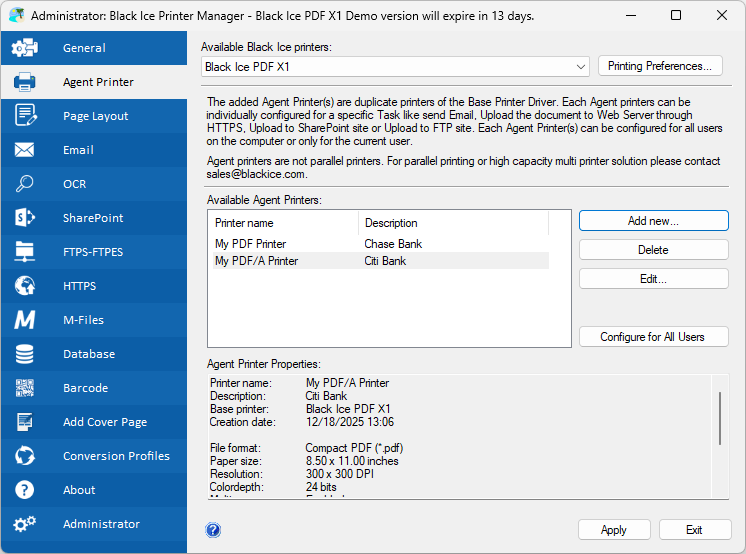 • Pre-configure single or multiple Agent printer for a specific task.