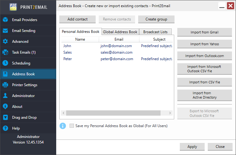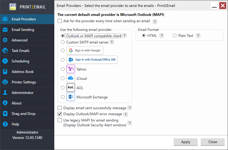 The Print2Email Server is an Email automation tool that converts any printable document to PDF, TIFF, or JPG and is attached to an Email. Compatible with any SMTP server, Office 365, Thunderbird, Live Mail, Gmail, Google Workspace, Yahoo, and more...