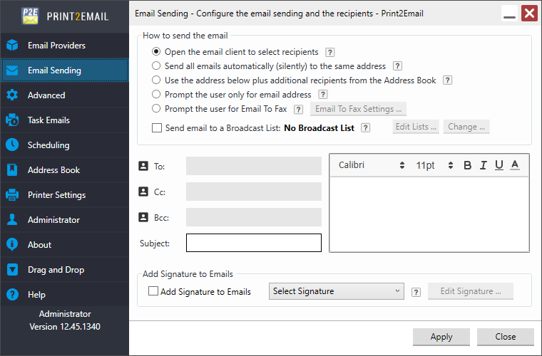 Print2Email Server is fully configurable with many options. Print2Email can be set to send every document to the same e-mail address or a new recipient can be chosen each time. The file format can be specified for PDF, JPEG, TIFF either color or black & white.