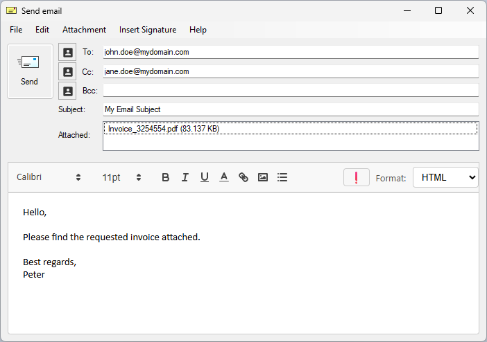The following parameters of the email sending can be specified with Content Base Email Sending Feature; Recipient(s), Carbon Copy (CC), Blink Carbon Copy (BCC), Email Subject, Email Body, External file as additional attachment, Password protection for the attached PDF document to open or edit the PDF.