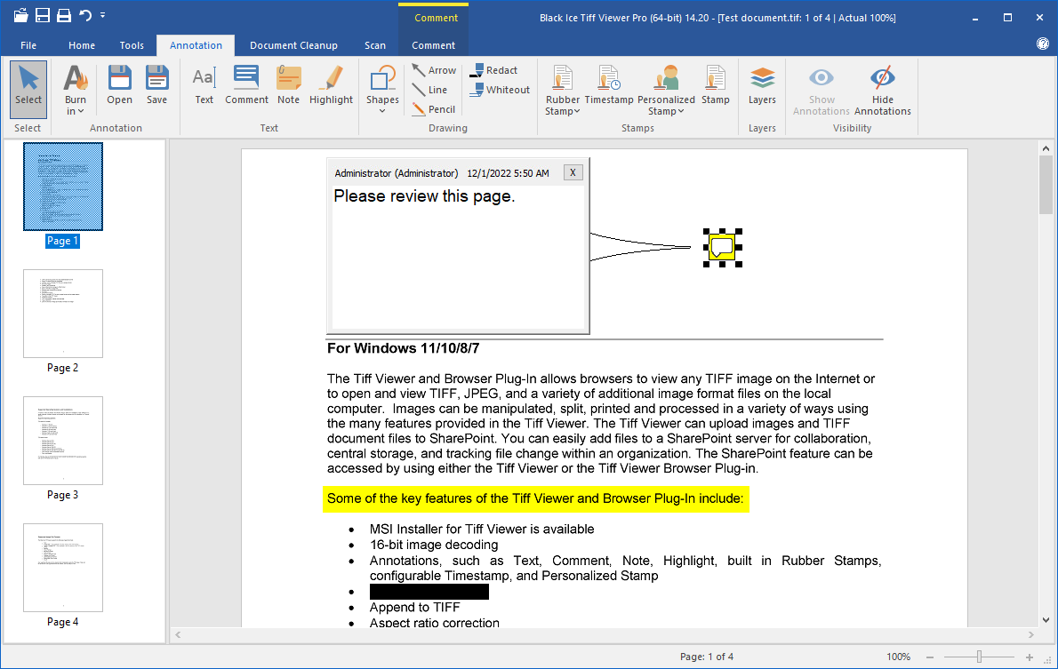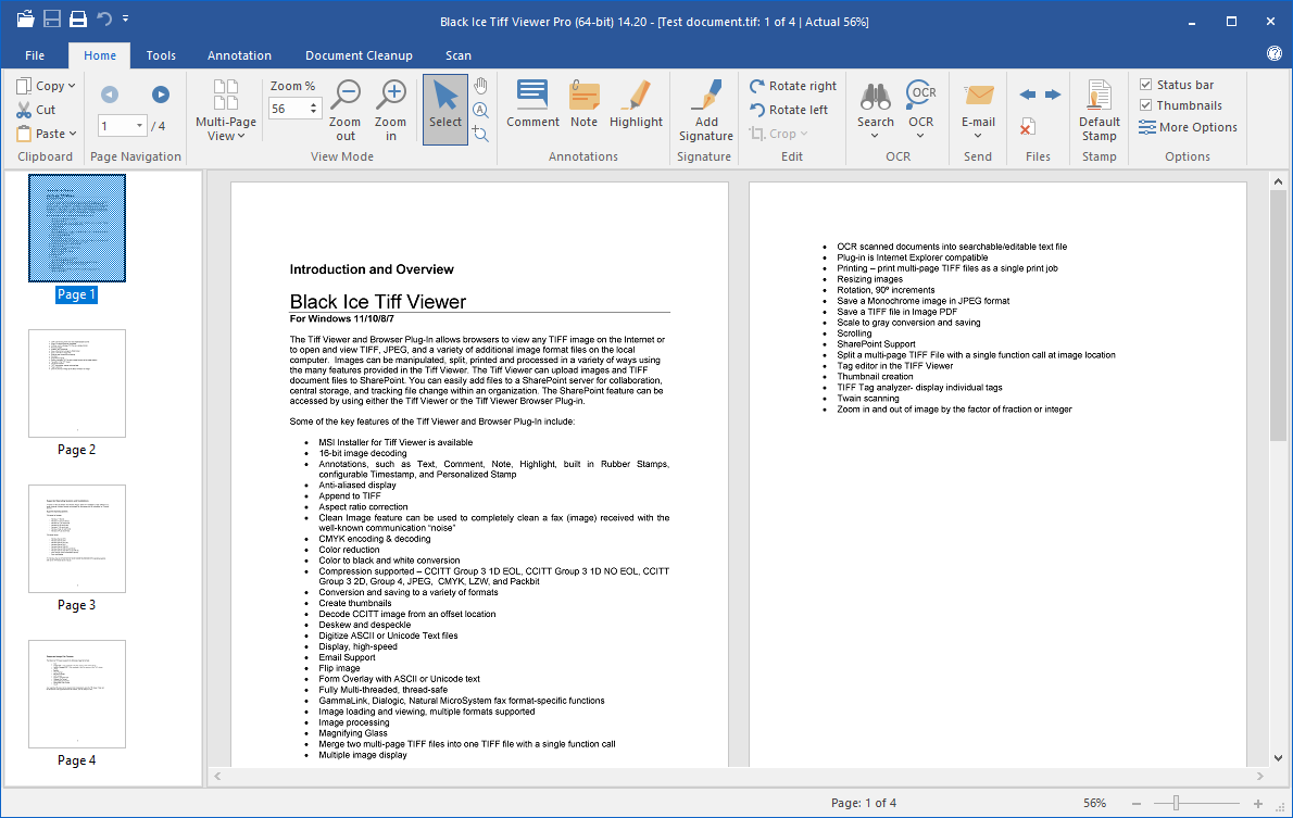 The TIFF Viewer Pro Server allows Terminal Server users to view, print, OCR, annotate, search (and redact highlighted search matches) documents, scan, batch scan, email, and edit TIFF images, Faxes, medical Faxes through the standalone user interface. The Tiff Viewer can display Microsoft Office Document Imaging (MODI) annotations, OCR data, and WANG annotations.