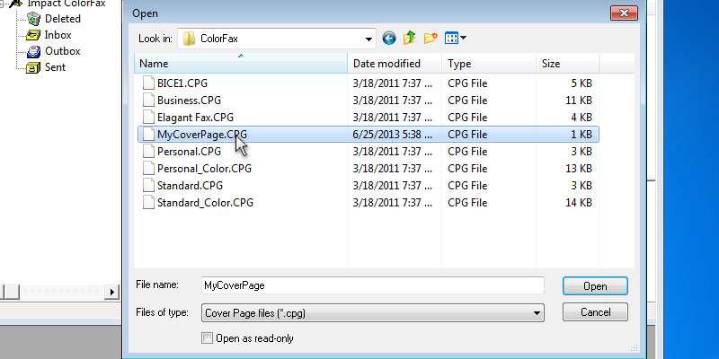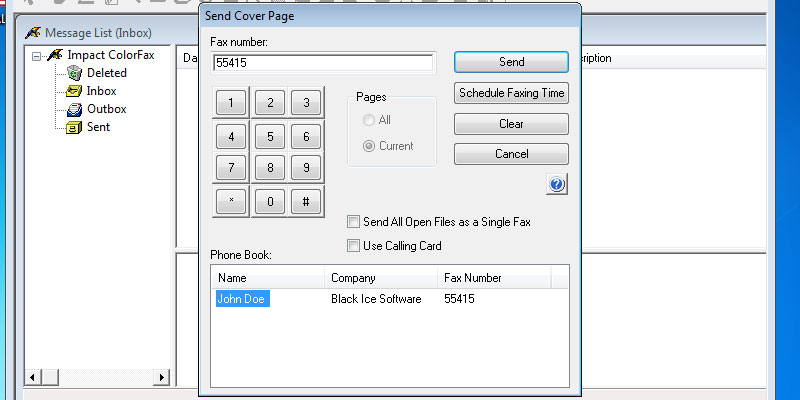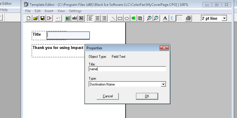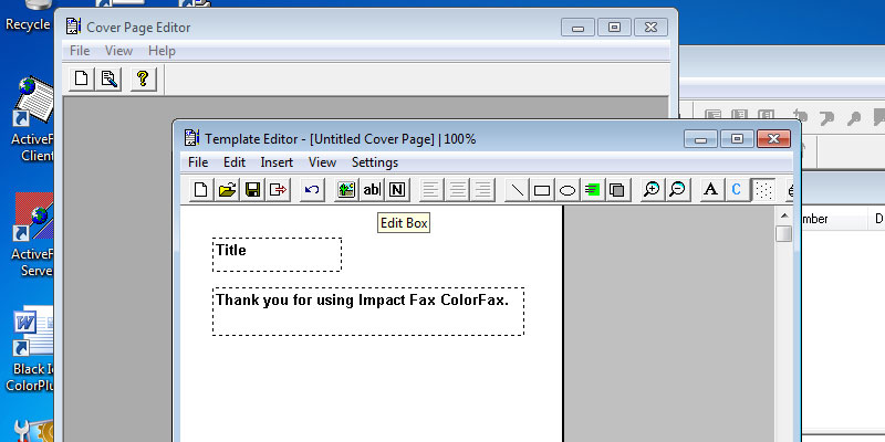 Start the Impact ColorFax from the Start menu.In the Impact ColorFax, go to the Tools > Cover Page > Run Cover Page EditorThe Cover Page Editor appears.In the Cover Page Editor, go to the File > Template Editor...The Template Editor appears. Open a template from the file menu.When the Template is opened, go to the File > New and create a new template.With the toolbar, the user can add text, images, annotations or edit boxes.With the Font icon on the toolbar, the user can specify the style of the added text.Add an Edit Box from the toolbar.Double click on the Edit Box, and the properties dialog will pop up, where the user can specify the title and the type of the Edit Box. If the Destination Name selected, the Impact ColorFax will add the name of the destination from the phone list.When finished editing, Go to File > Save, and save the Template.Go back to the Impact ColorFax, and click on Fax > Send Cover Page...In the Send Cover Page windows, select the destination from the Phone Book, and click on the Send button.Open the created Cover Page.The destination name is on the sent Cover Page. Thank you for using Impact ColorFax. Click here to go back to the Tutorials.