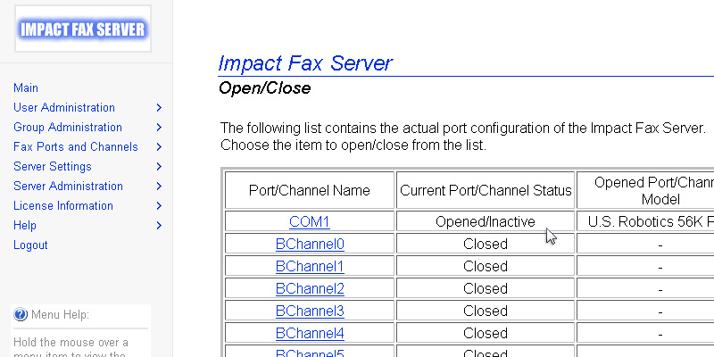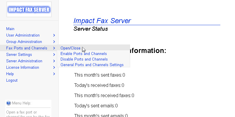 To reach the Impact Fax Server Administrator login, open a web browser and type localhost:1172 as a regular website.Enter the password, and click on the 'Submit' button.The Fax Server Administration page appears. All general information about the server can be found on this Main page.Go to the Fax Ports and Channels > Open/Close.Click on the appropriate COM port. NOTE: If the desired COM port is not displayed, make sure that the port is not in use by any other application ( even if an application is closed it could still be using the port )Scroll down on the page, and enter the preferred prefix beside the Phone Nr Prefix. When finished, click on the Submit button.If the user information is successfully modified, the following page appears. Thank you for using Impact Fax Server. Click here to see more tutorials.
