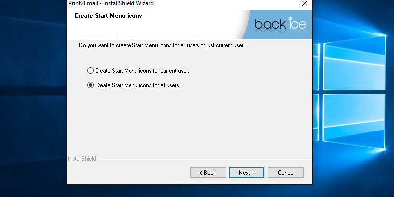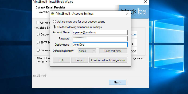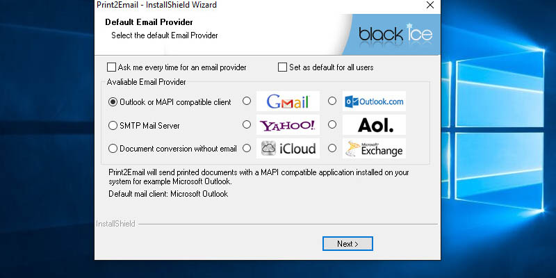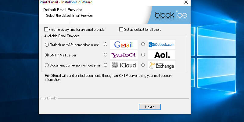 To begin installation, double click on the downloaded Print2EmailSetup.exe. The following screen will be displayed. Click the 'Next' button to continue.Review the license agreement, and select 'I accept the terms of the license agreement' radio button. Press 'Next' to continue.The next screen will present an option of installing Print2Email for all users or just the current user. Press 'Next' to continue.Select the installation directory of the Print2Email or use the default destination folder. Press 'Next' to continue.Specify the desired name for Print2Email to appear under Start > Programs or use the default settings. Press 'Next' to continue.The InstallShield Wizard will install the Black Ice Print2Email.Specify the output directory of the converted documents.Print2Email Demo automatically registers the Demo during installation. A dialog will appear confirming that the Print2Email Demo has successfully registered over the internet.The following dialog box will now appear and prompt you for the file type for the image attachments. Select the desired file format and press Next to continue. Please note: The user can change the image type at any time using the 'Printer settings' in the Control Center.The following screen will present options to configure what Print2Email should use as the default E-mail provider. You can configure these options later in the Print2Email Control Center.The user can select the commonly used email providers by select the radio button, and enter the email address and password.When a commonly used email provider was selected, such as Gmail, click on the Next button to configure the account settings.The user can configure the SMTP settings by selecting the 'SMTP Mail Server' radio button, and click on the Next button.In the SMTP Settings, enter all the required information of the SMTP server.Print2Email can be used as a stand alone document converter without email configuration by selecting the 'Document conversion without email' radio button.The following dialog will appear, and the user can select to 'Place program shortcut icon on desktop,' 'Start Print2Email when I start Windows,''View Print2Email Documentation' and 'Install The Free Tiff Viewer.' Press the 'Next' button to continue.Press 'Finish' button to complete the installation. Thank you for using Black Ice Print2Email. Click here to see more tutorials.