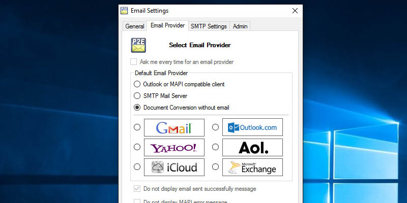 On Print2Email Control Center, click on the Email Settings option.Under the Email Providers tab, select the Document Conversion without email option, and click OK to apply the changes. From now on, when printing to the Print2Email, the software will only convert and save the document, without sending it in email.On the Print2Email Control Center, click on the Printer Settings option.In the Printer Settings, one can configure the document conversion with Print2Email.